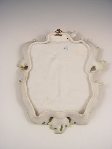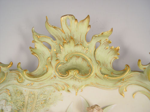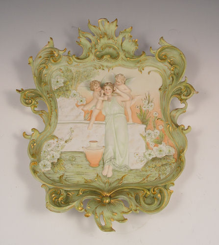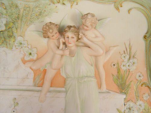 VOLKSTEDT GERMAN BISQUE PLAQUE: Woman and cherubs, ornate acanthus leaf, scroll and gilt border. 13'' x 11''.