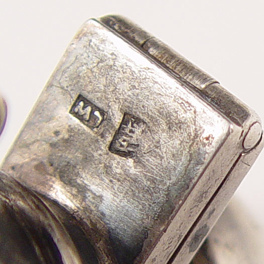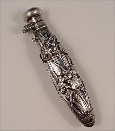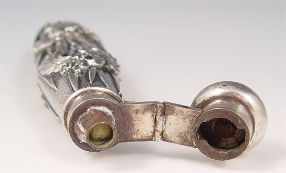 ART NOUVEAU SILVER VINAIGRETTE / SCENT BOTTLE: Chinese export silver hallmarks on hinge for lid. Measures 6'' long. Approx 2.3 troy oz., unknown silver content.