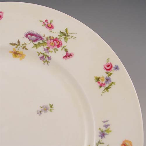 FRENCH LIMOGES CHINA SERVICE: Bernardaud & Co. Approx. 88 pieces to include 5 dinner plates, 10 salad plates, 8 bread plates, 12 dessert bowls, 5 cups, 6 bouillon cups, 21 saucers, 9 demi cups with 7 saucers, gravy boat, round covered butter, covered vegetable and platter.