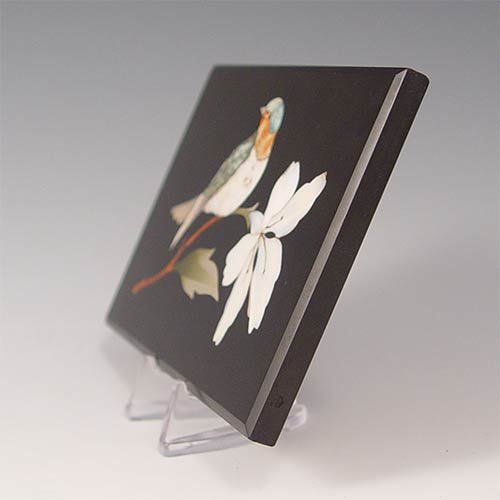 PIETRA DURA STONE INLAY PLAQUE: A sampling of stone and marble depicting a bird. 3 1/2'' x 4 1/4''.