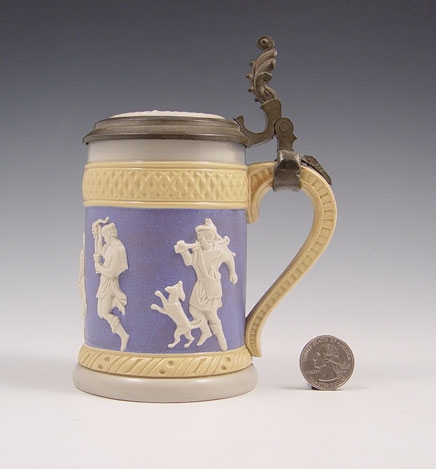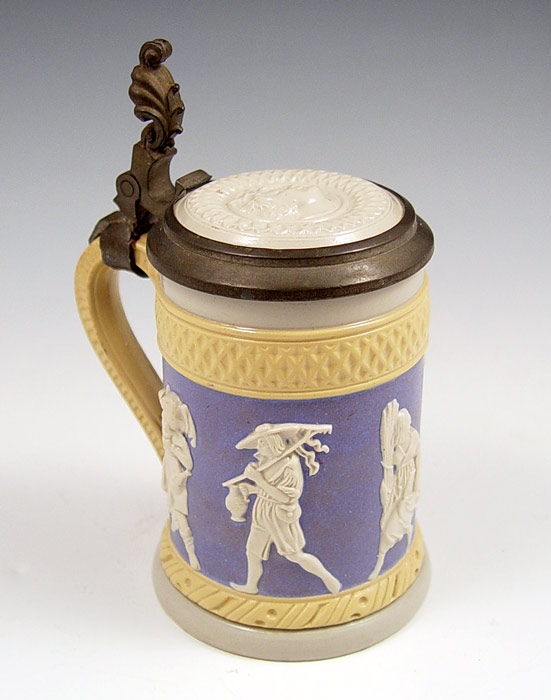 METTLACH RELIEF STEIN #171: 1/2 liter, relief figural designs. Measures 6 1/4'' high to top of thumb press, 4 1/2'' at handle.