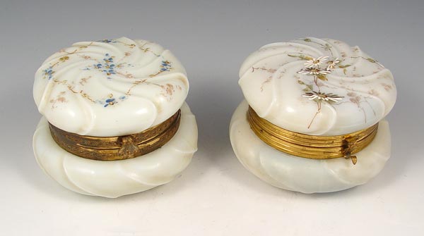 2 CF MONROE WAVECREST DRESSER BOXES: Floral decorated hinged jars in the same swirled form. One is signed. 4'' dia.