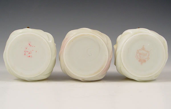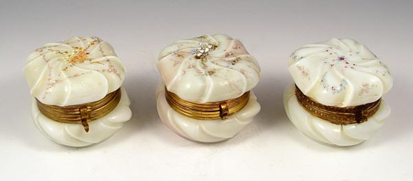 GROUP OF 3 CF MONROE WAVECREST DRESSER JARS: Smaller versions, all in the same swirl form with different enamel floral decoration. 3'' dia.