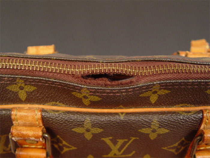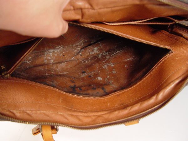 CONDITION: Note overall condition, staining to leather, interior zipper pocket will need proper cleaning, minor zipper separation on handbag.