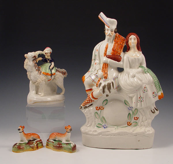 4 STAFFORDSHIRE FIGURES: Includes 1) Pair of dogs, note one foot missing. Measures 2 1/2'' h. x 3 1/2'' each. 2) Girl on goat, note professional restoration to head. 6'' h. x 5 1/2''. 3) 2 figures man and woman. Measures 13 1/2'' h. x 7 1/2'' x 2 1/2''. All pieces unmarked.