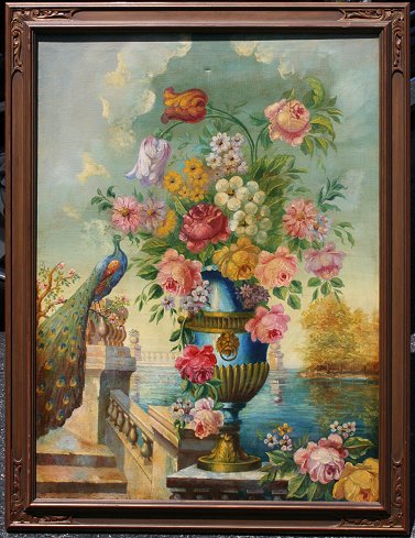 LARGE NEOCLASSICAL STILL LIFE OF FLOWERS AND PEACOCK: Oil/Canvas, 36'' x 27'', no visible signature, encased in a carved impressionist frame, 41'' x 32''.