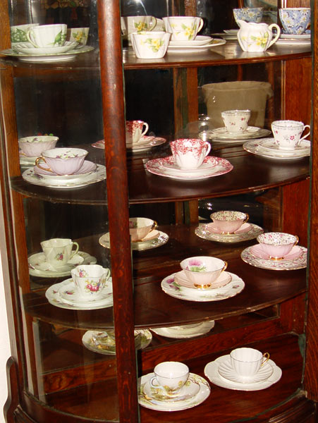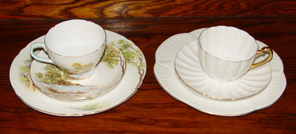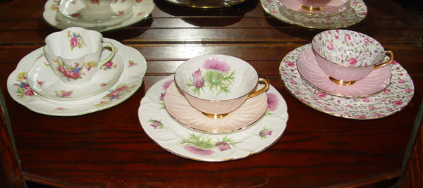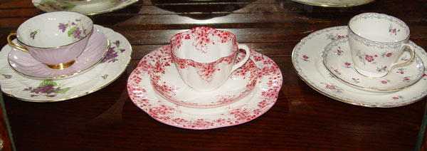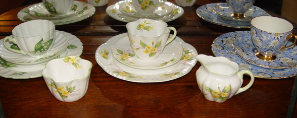 11 SHELLEY BONE CHINA TRIO SETS: 11 different patterns of Cup, saucer, and plate. Patterns include Primrose, Dainty Pink, Lily of the Valley, Blue Danube, and more. Also included is a Primrose cream and sugar.