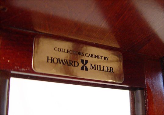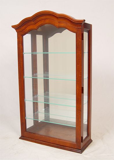 HOWARD MILLER SHELF OR WALL MOUNT DISPLAY CASE: Glass shelves, measures 33 5/8'' h. x 20'' x 8 3/8'', hanging bracket in office.