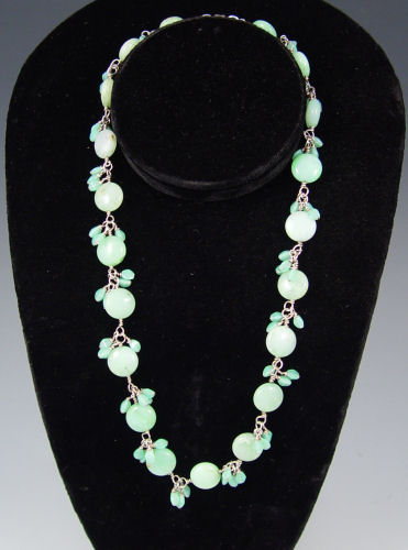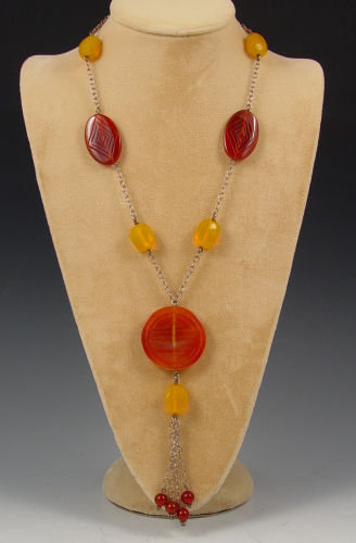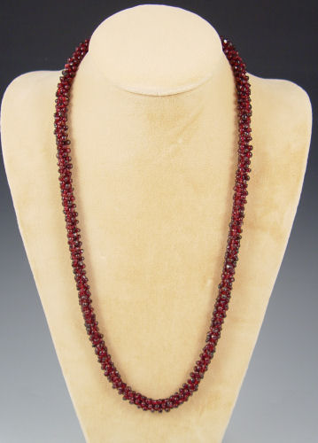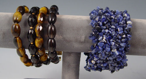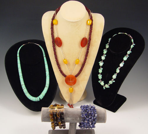 6 PIECE STONE JEWELRY: 1) Sodalite bracelet, 1 1/2'' wide. 2) A 4 strand tiger eye and quartz bracelet. 3) A 24'' strand garnet beads 4) Green glass beads 5) Necklace of synthetic turquoise discs. 6) Long necklace of carved and faceted stones with a BC tag.