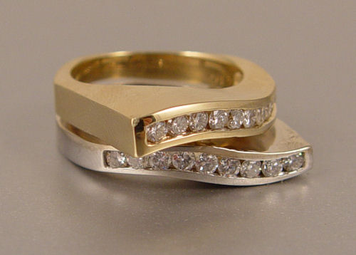 DESIGNER 14K TWO TONE DIAMOND RING: 14K white and yellow gold contains 18 round brilliant cut diamonds. Total weight approx. 1 Ct. Rated VS-SI in clarity and G-H in color. The diamonds are channel set. Size 6. Weight 12.6 grams.