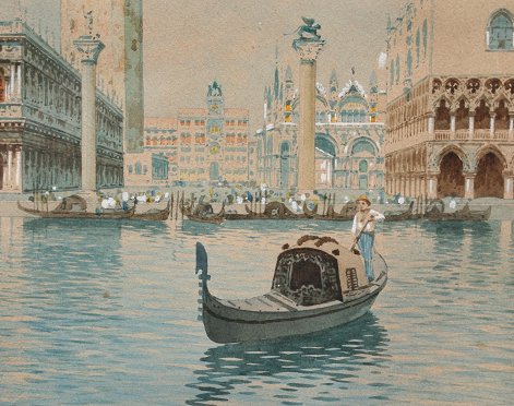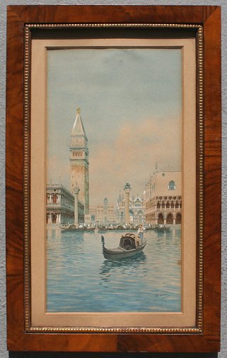 VENETIAN CANAL SCENE, ST MARKS SQUARE WITH GONDOLIER: Watercolor heightened by white, 14 1/2'' x 7 1/2'', signed lower right, encased in burl wood veneered frame, 19'' x 11 3/4''.