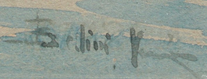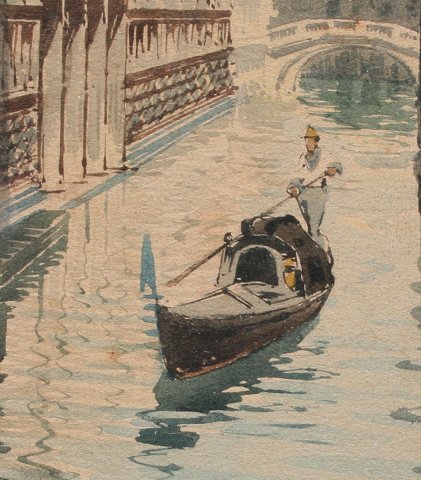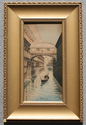VENETIAN CANAL SCENE, BRIDGE OF SIGHS: W/C, sight size 11 1/2'' x 5 1/2'', illegible signed, encased in period gilded gesso frame with wear and over-paint, 17 1/2'' x 12''.