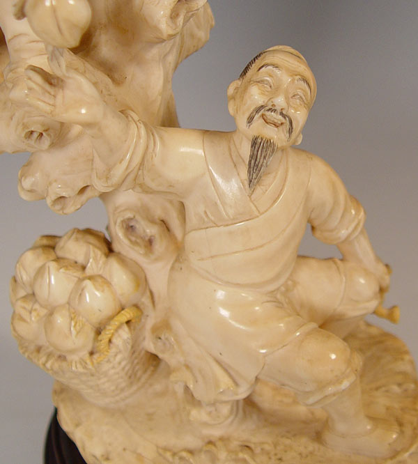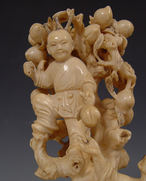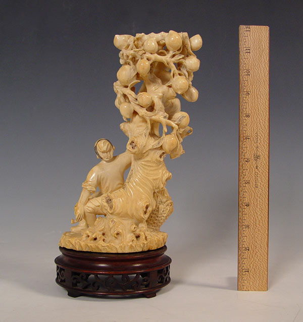 CHINESE LARGE CARVED IVORY FIGURAL GROUP: Man and young boy in a peach tree. Ivory alone is 9 3/4'' tall, with wood base 12'' tall.
