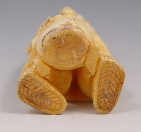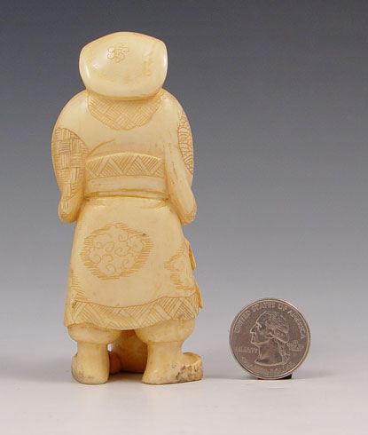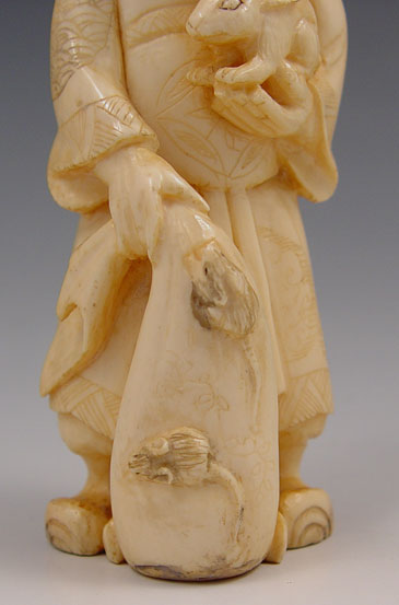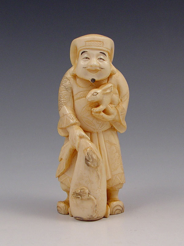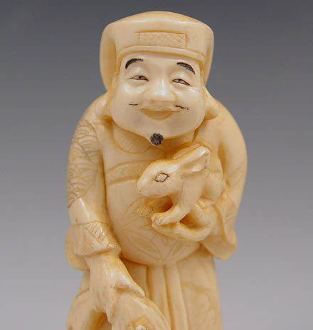 CHINESE CARVED IVORY FIGURE OF MAN WITH RABBIT: Man with a big smile on his face, a rabbit in his arms and a sack with rats crawling on it. Ivory is 4'' h.