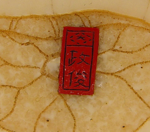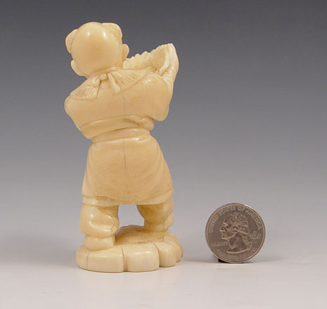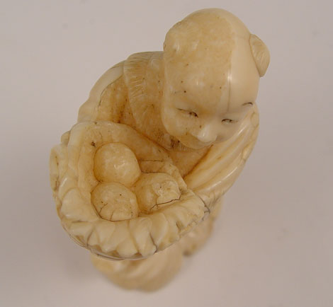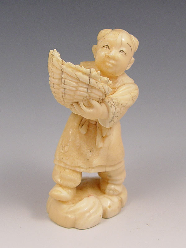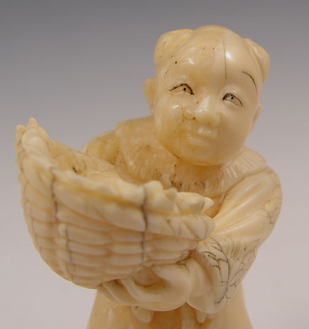 CARVED IVORY FIGURE OF MAN WITH BASKET OF FRUIT: Signed, 3 3/4'', age cracks.