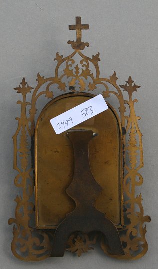 MINIATURE PAINTING ON PORCELAIN OF THE MADONNA DELLA SEDIA: Circa 1910, painting approx. 3 1/2'' x 2 1/4'', encased in pierced metal religious motif frame, overall 7 1/2'' x 5 1/4''.