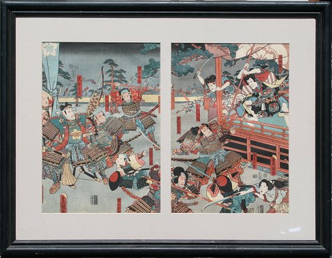 19th C JAPANESE DIPTYCH WOODBLOCK by TOYOKUNI III, 1857: Depicting samurai warriors in battle, sight size 13 1/4'' x 9 1/4'' each, not taped together, not laid down, framed and matted, 20'' x 26''.
