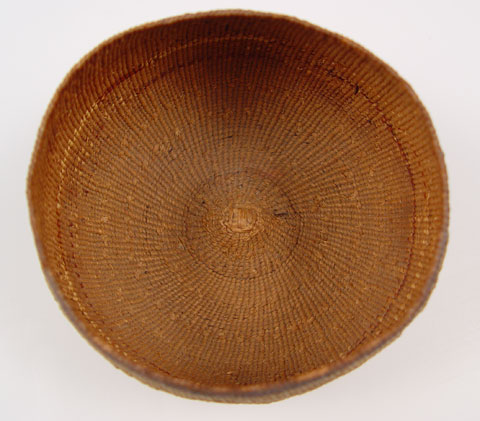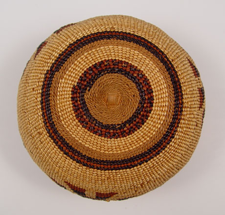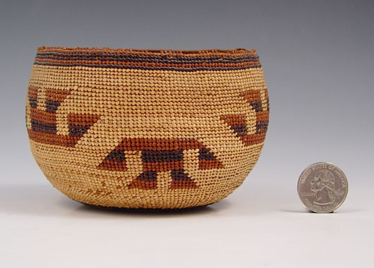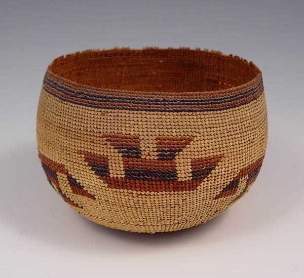 CALIFORNIA NATIVE AMERICAN YUROK WOVEN BASKET: Circa early 1900's. Geometric figural design, 3 1/4'' h x 4 1/2'' dia.