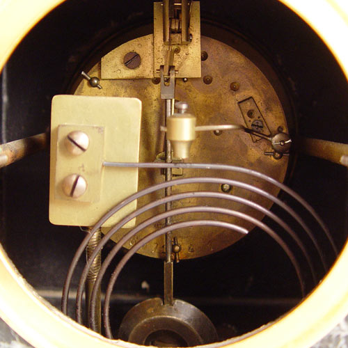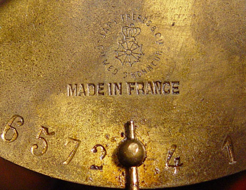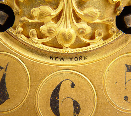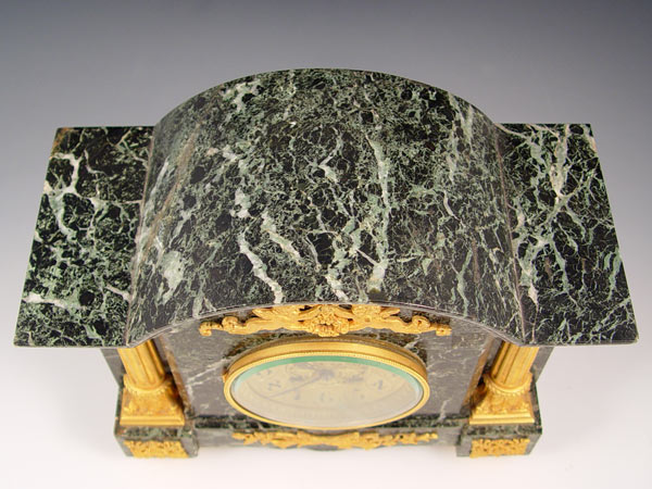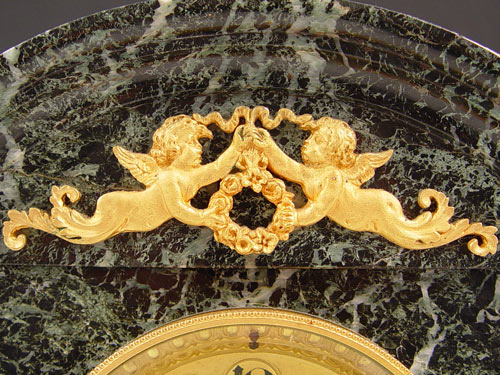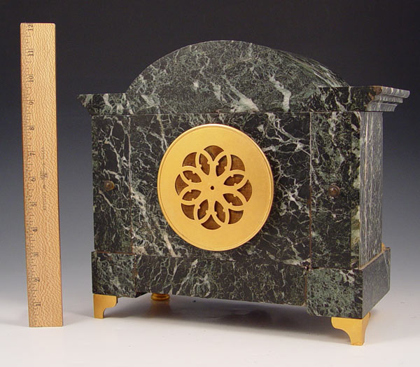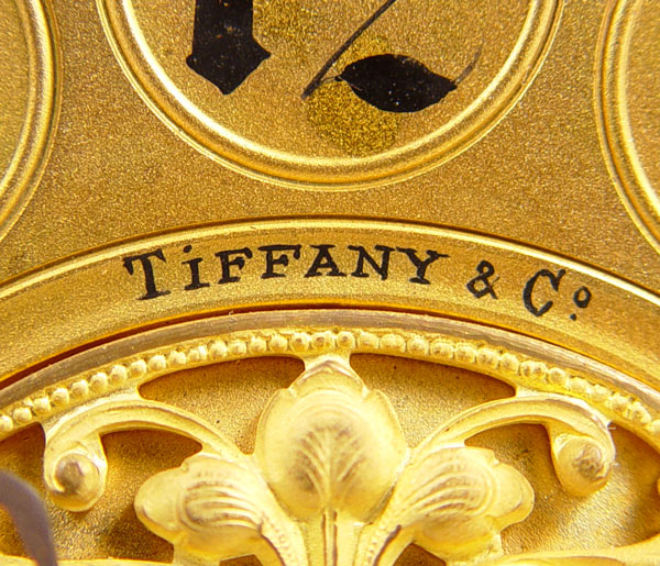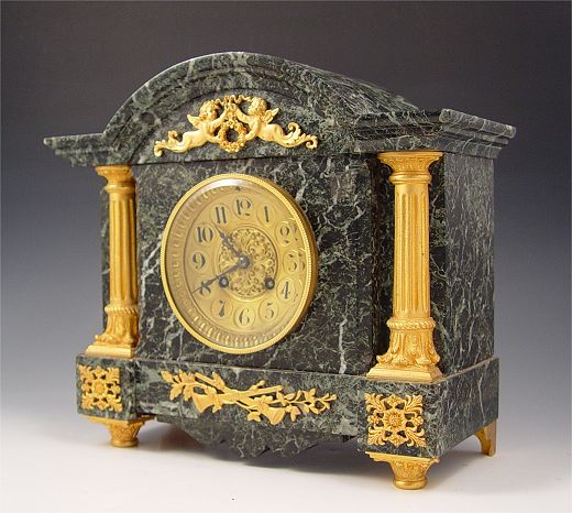 TIFFANY & CO. MARBLE MANTLE CLOCK: Japy Freres movement, marked Tiffany & Co., New York on face. Marble case with bronzed mounts including cupids, horns and floral decoration. With replacement key and pendulum. Measures 11 1/8'' high x 12 1/2'' x 5 1/2''