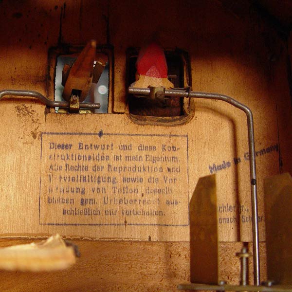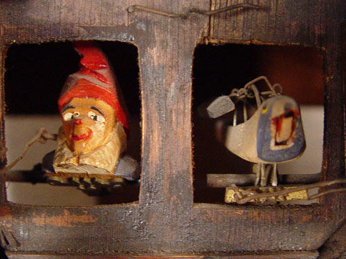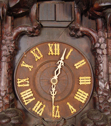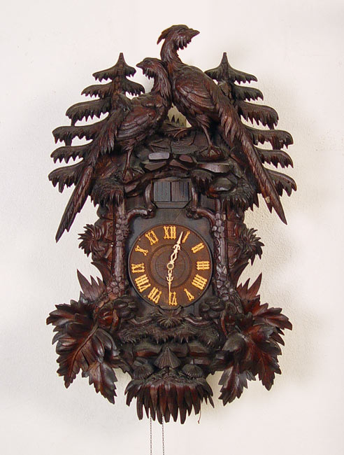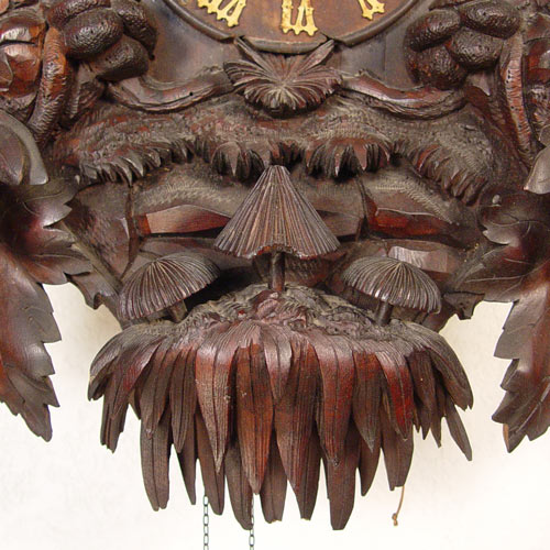 IMPRESSIVE BLACK FOREST CARVED CUCKOO CLOCK: Early 20th century, carvings include double birds, trees, mushrooms and other designs. Marked on Cuckoo Clock Mfg Co. on mechanism. Has 2 pinecone weights. Small music box in case, measures 31'' high x 19 1/2'' x 8''.