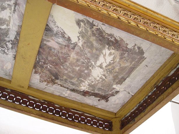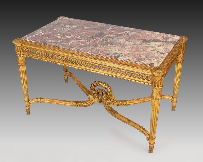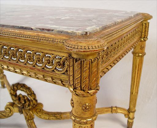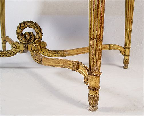 19th C LOUIS XVI STYLE FRENCH GILT WOOD SIDE TABLE: Marble top over a heavily carved, gesso and gilt frame. Reticulated and beaded skirt, reeded tapered legs, crossed stretcher base with three dimensional, upright wreath at center. 29 1/2'' h. x 50 1.2'' x 30''. Professional restoration to marble