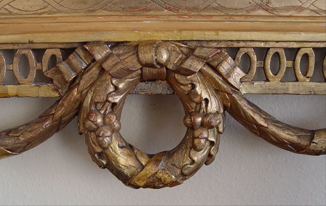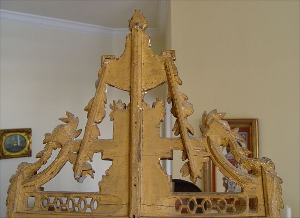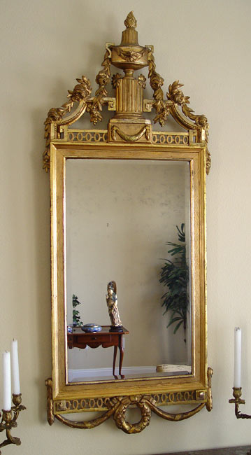 18th C FRENCH GILTWOOD LOOKING GLASS: The frame with a rose and urn carved crest and flame finial. Bottom frame with swag and laurel wreath. Great condition with minor touch up. 68'' tall x 27 1/2'' x 3'' deep.