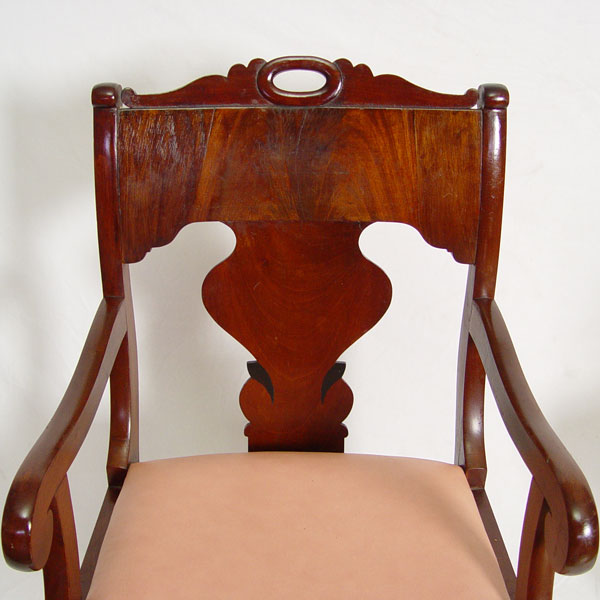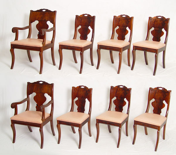 SET OF 8 EMPIRE MAHOGANY DINING CHAIRS: 2 arm chairs, 6 side chairs. Wide central vertical slat, slight curved back. Arm chairs are 37'' h. x 21 1/2'' x 22. Side chairs 34'' tall x 16'' x 21''.