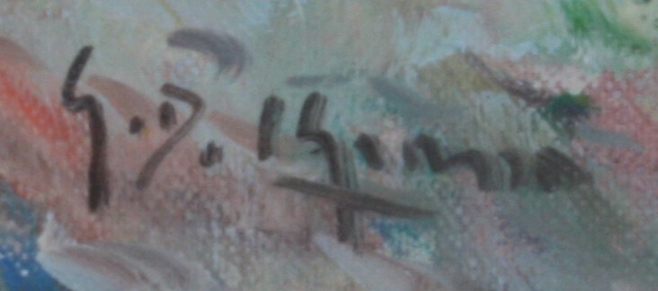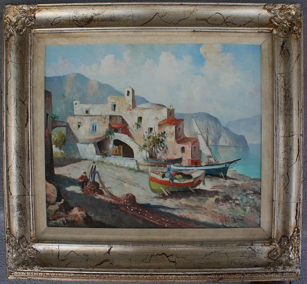 DEL GRASSO, Gianni, (Italian, 20th c.): Coastal Scene with Figures and Boats, Oil/Canvas, 16'' x 20'', signed, framed, 23'' x 27''.