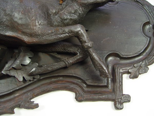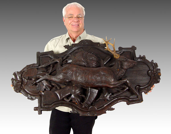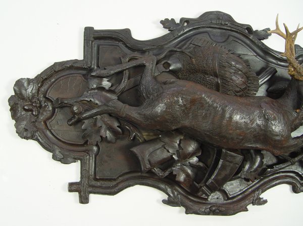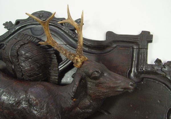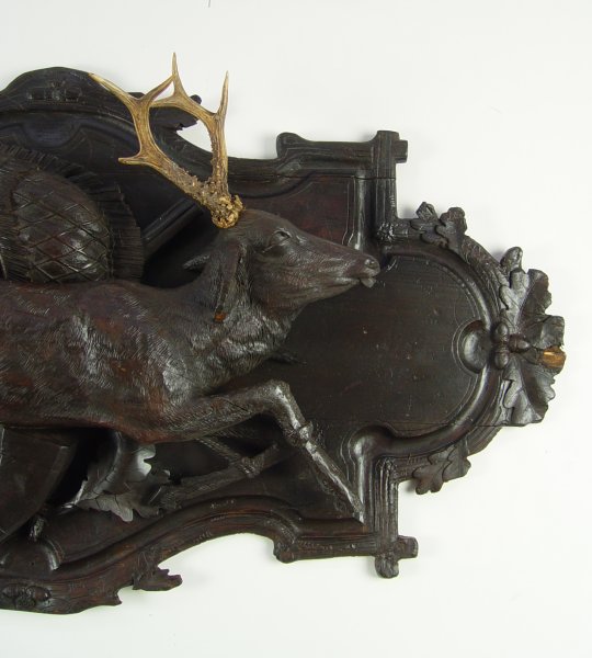 BLACK FOREST CARVED STAG AND HUNT PLAQUE: Finely detailed carved wall hanging featuring full body stag with real antlers, musket, satchel, powder horn & oak leaves. Measures 46 1/2'' h. x 25'' x 8 1/2''.