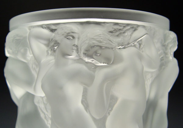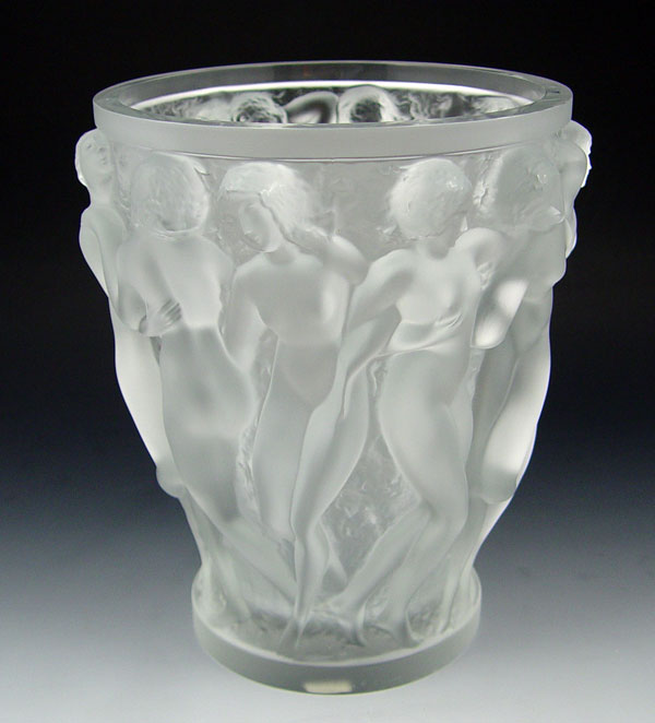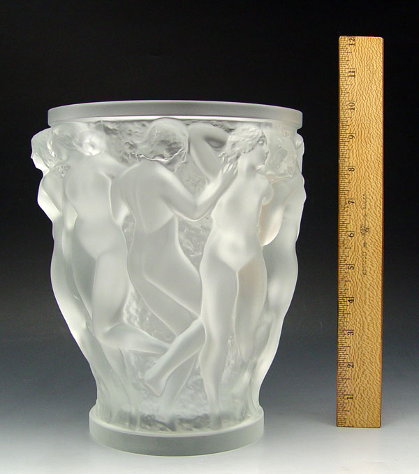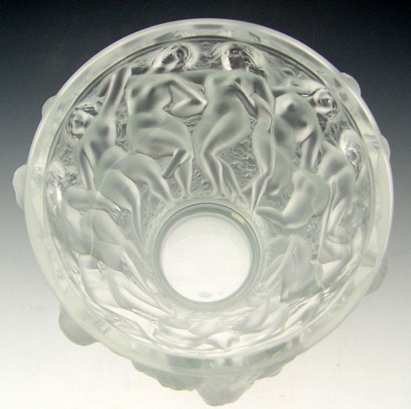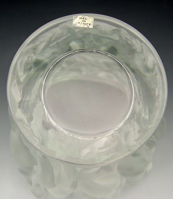 LALIQUE FRENCH ART GLASS BACCHANTES VASE: Overall molded with nude maidens, Lalique France trademark, Made in France paper label. 9 1/2'' h x 8 1/4 dia.