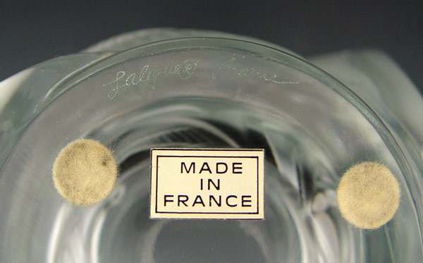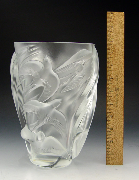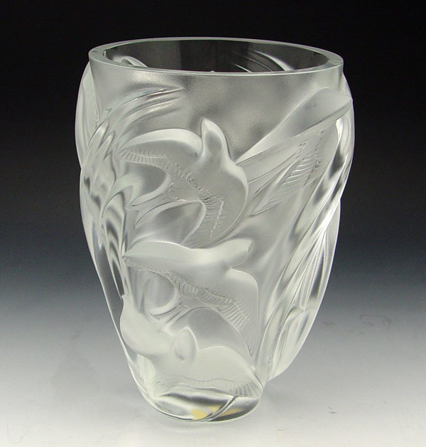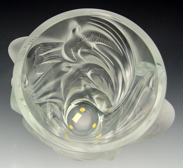 LALIQUE FRENCH ART GLASS MARTINETS VASE: Molded birds in high relief, Lalique France Trademark, made in France paper label. 9 1/2'' X 8'' dia.
