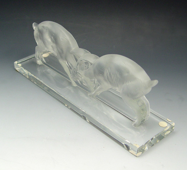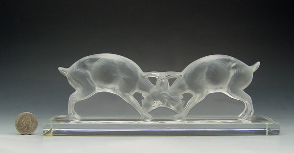 LALIQUE CRYSTAL RAMS IN COMBAT SCULPTURE: 3 1/4'' h. x 10'' x 2 5/8. Signed Lalique France.