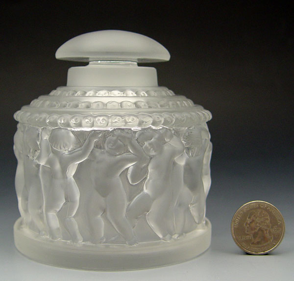 LALIQUE ENFANTS DRESSER JAR: Frieze of nude babies under the stepped shoulders, large button stopper, frosted. Lalique France trademark. 4'' x 3 5/8'' dia.
