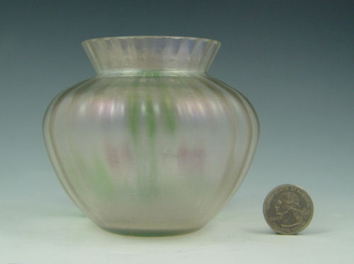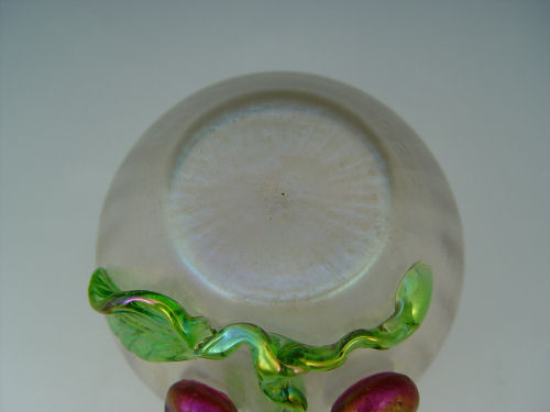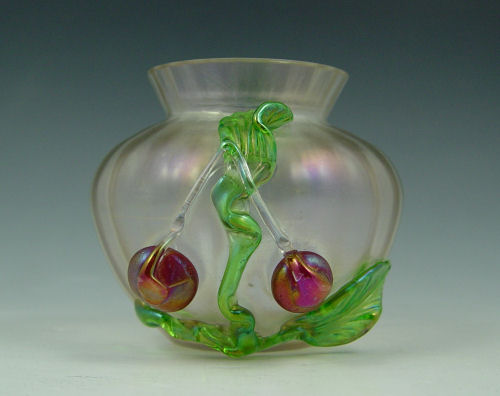 WILHELM KRALIK SOHN BOHEMIAN IRIDESCENT ART GLASS CHERRY VASE: Applied cherries and leaves. 3 1/2'' tall. As seen in Robert and Deborah Truitt's ''Collectible Bohemian Glass 1880-1940, page 79.