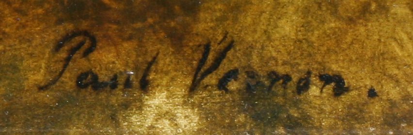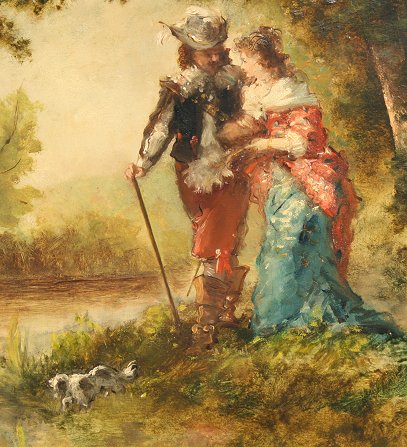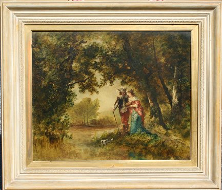 VERNON, Paul, (French, 1796-1875): Lovers Walk, A Cavalier Walking with Maiden Through a Forest with King Charles Spaniel, OIL/Cradled Panel, 17 1/2'' x 21 1/2'', signed, framed, 25'' x 29 1/2''.