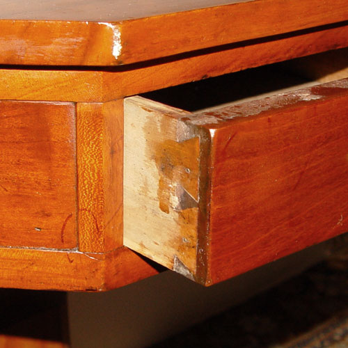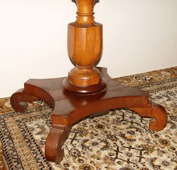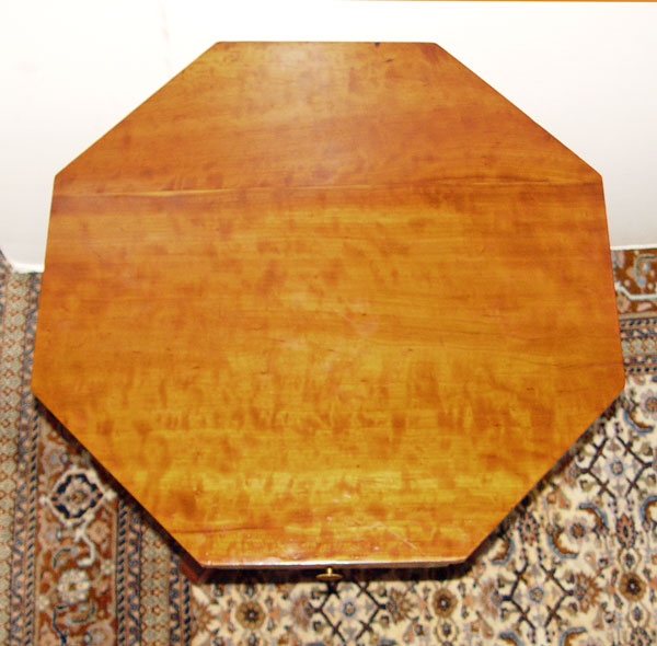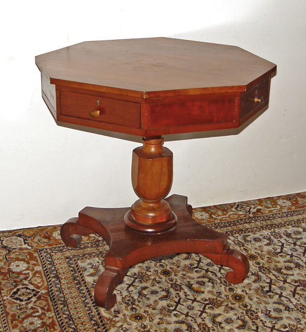 CHERRY OCTAGONAL REVOLVING GAME TABLE: Swivel top, 4 drawer top rotates over central pedestal with rolled leg base. 27'' tall x 28 1/2'' dia.