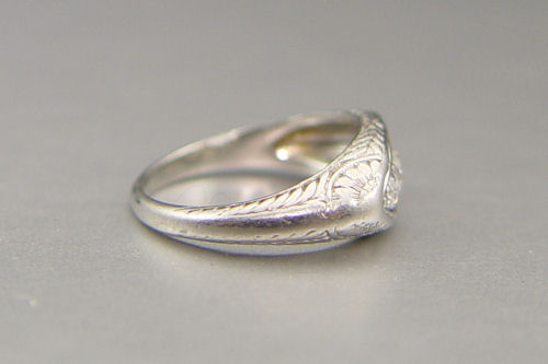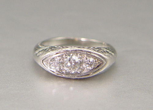 3 STONE PLATINUM ART DECO YOUTH OR PINKY RING: Platinum diamond ring contains three round transitional cut diamonds. WEIGHT: .35 Ct. Approx. The diamond average VS in clarity and G-H in color. The diamonds are bead set. Weight: 3.3 grams. Size: 2.75