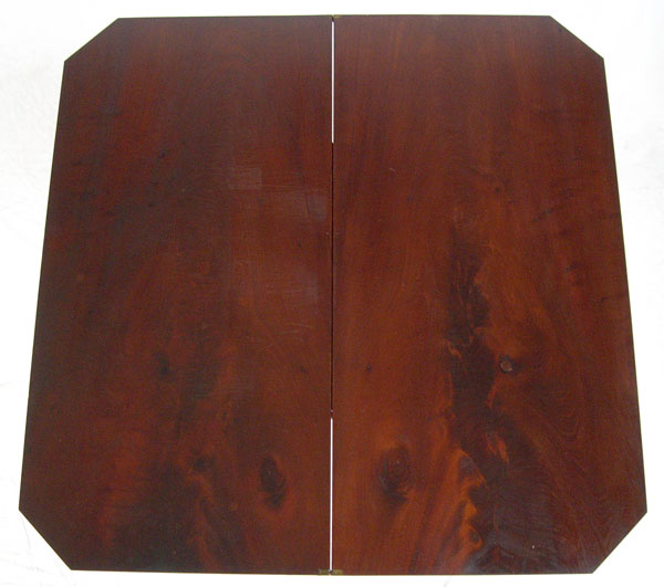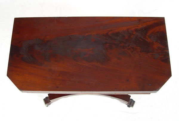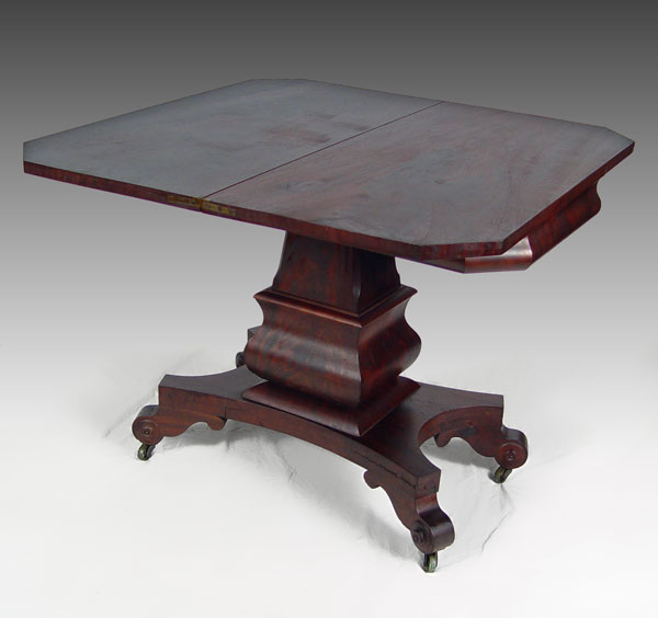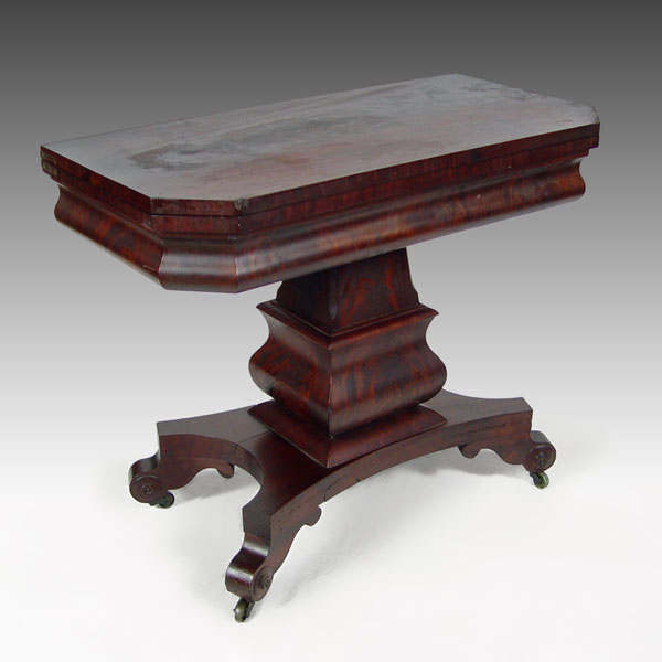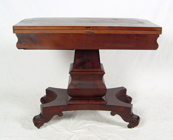 AMERICAN EMPIRE PERIOD GAME TABLE: Flame grain mahogany veneer, substantial shaped pedestal base on scrolled feet, original casters. 28'' tall x 36'' x 18''.