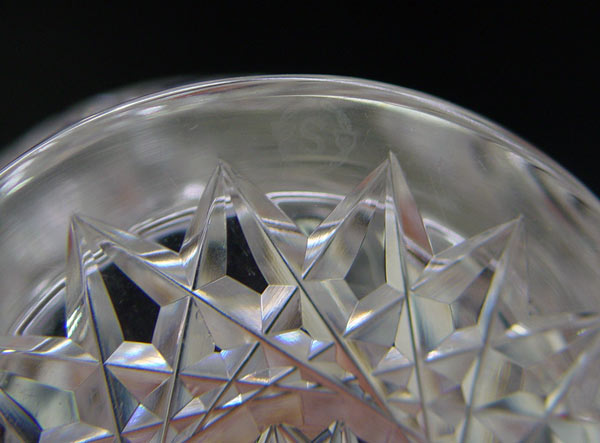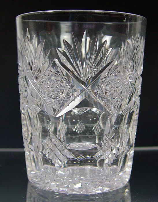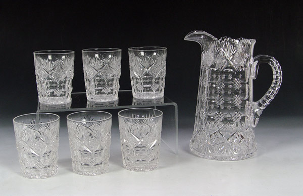 H.P. SINCLAIR AMERICAN BRILLIANT CUT GLASS PITCHER & 6 TUMBLERS: Matching set of exquisitely cut water pitcher (9'') and matching tumblers (3 7/8''). The tumblers do bear the S in wreath mark for H.P. Sinclair, Corning N.Y., 1904-1928.