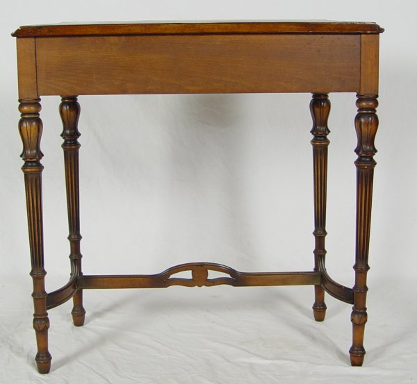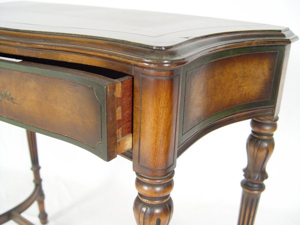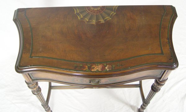 PAINT DECORATED FOYER TABLE AND MIRROR: CA. 1920- 40'S. Mahogany veneer with hand painted decoration. Single drawer table and arched mirror. Table, 30'' tall x 30'' x 13'' deep. Mirror, 13 1/2'' x 12 1/2''.