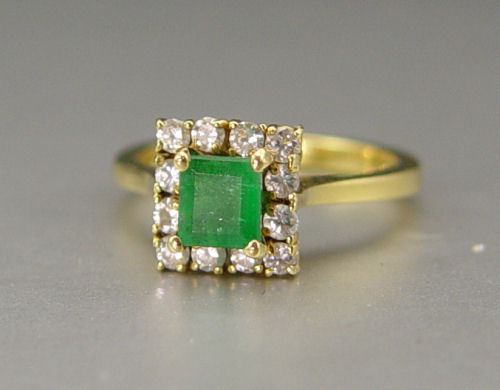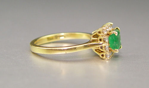 18K EMERALD & DIAMOND RING: 18K yellow gold ring contains one emerald cut emerald. WEIGHT: .70 Ct. Approx. Rated SI in clarity (Type III), G in hue, 4 in Tone and 3-4 in Saturation. Twelve round brilliant cut diamonds. WEIGHT: .25 Ct. Approx. The diamonds average SV in clarity and H-I in color. The emerald and diamonds are prong set. Weight: 3.6 grams. Size: 5.5