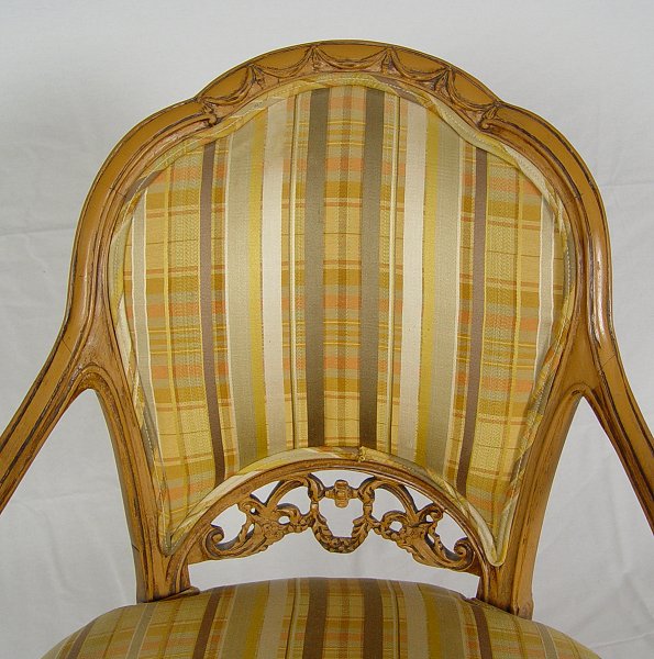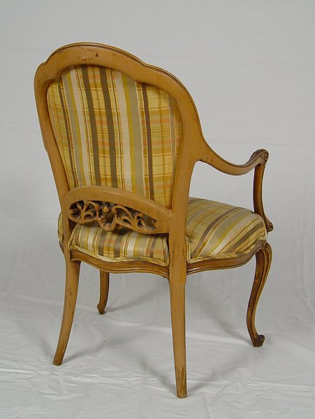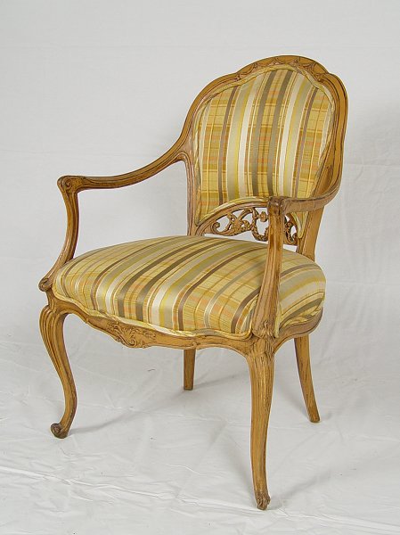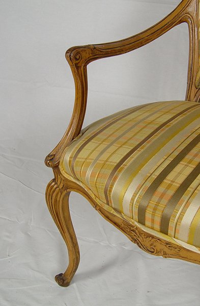 ITALIAN CARVED BERGERE CHAIR: Graceful open arm chair, soft colored wood frame carved at the top rail, skirt, and knees of the cabriole legs. Floral plaid back and seat. 36 1/2''h. x 25'' w x 26'' deep.