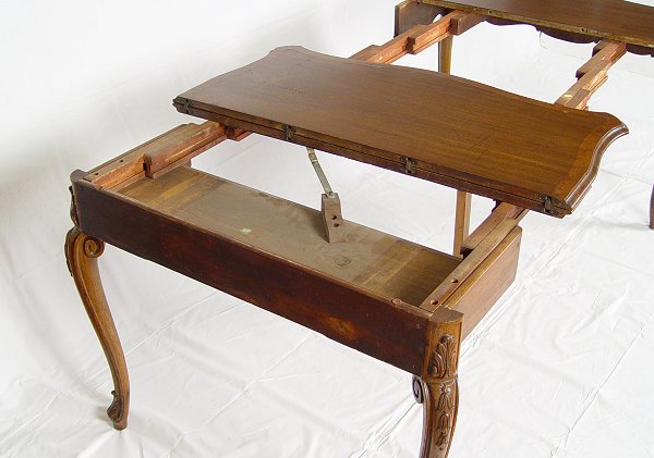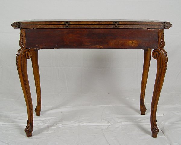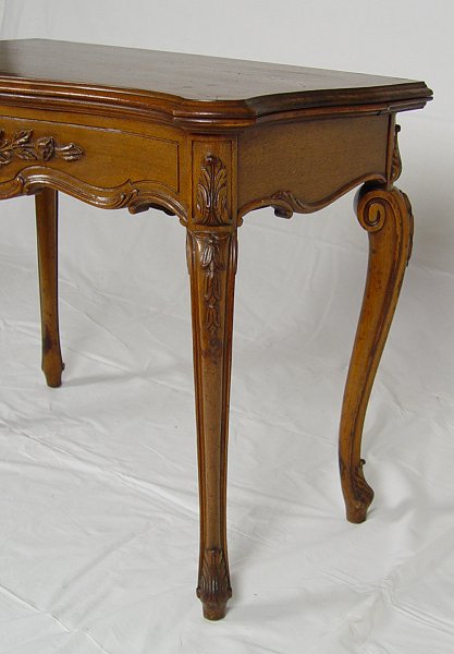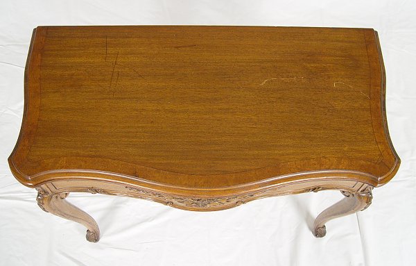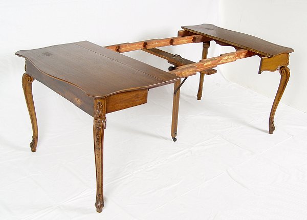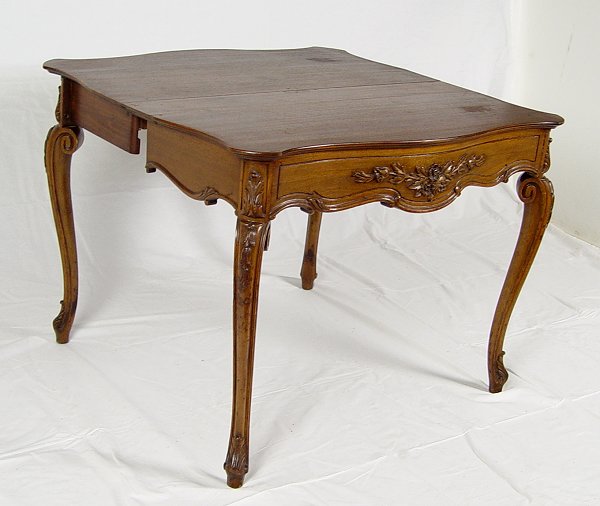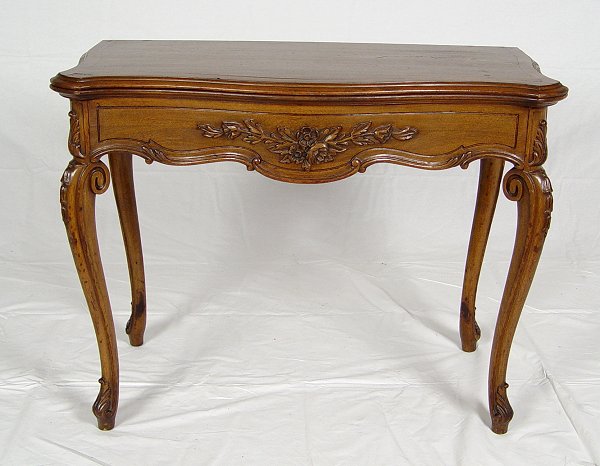 MID 20TH C CARVED EXTENSION TABLE: Flip top foyer table will convert to a dining table with added leaves (not included). Floral carved apron and graceful cabriole legs with bell flower design. 31'' h. x 39'' x 20''.