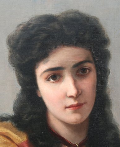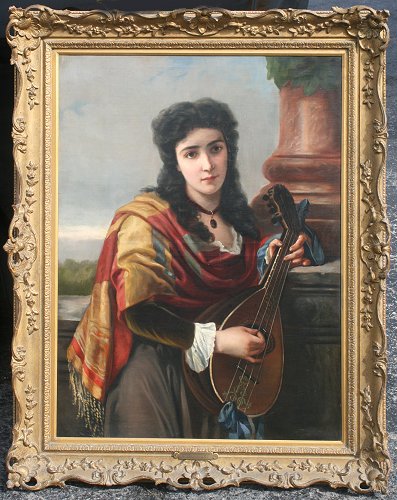 ATTRACTIVE 19TH C. OIL/CANVAS OF YOUNG BEAUTY WITH MANDOLIN: Illegibly signed, 39'' x 29'', period gilded gesso frame with wear, 47'' x 37''.