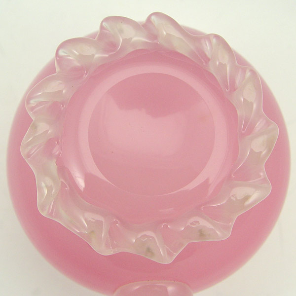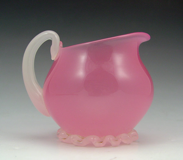 STEUBEN ROSALINE SMALL PITCHER: Pink opaline with white applied handle and ruffle base. Unsigned, 3 1/2'' tall.