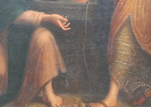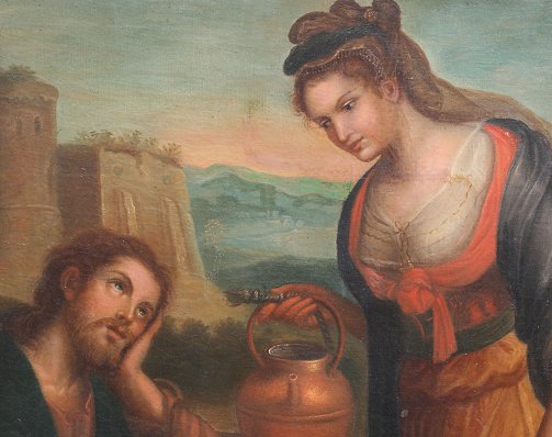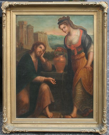 19TH C. OIL/CANVAS OF CHRIST AND THE WOMAN OF SAMARIA AFTER FONTANA: 39'' x 29'', faint signature verso on original canvas, gilded gesso frame with wear, 49'' x 39''.