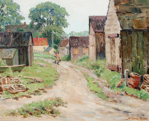 RIDER, Henry Orne, (American, 1860-): ''A Lane in Lansville, Between the Lobster Sheds'', Oil/Board, 16'' x 20'', signed and titled verso, dated 1932, framed, 20'' x 24''.
