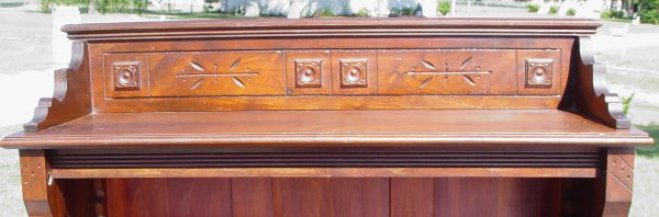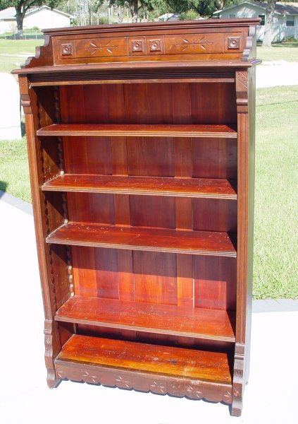 EASTLAKE VICTORIAN OPEN BOOKCASE: Incised carvings on the gallery, adjustable shelves, casters. 60'' tall x 35 1/2'' x 12''.