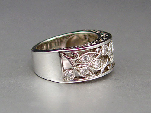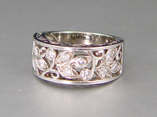 14K WHITE GOLD STYLIZED LEAF DIAMOND BAND: 14K white gold diamond band contains twelve round brilliant cut diamonds. WEIGHT: .60 Ct. Approx. The diamonds average SI in clarity and H-I in color. The diamonds are prong set. Stylized leaf motif. Weight: 8.5 grams. Size:6.