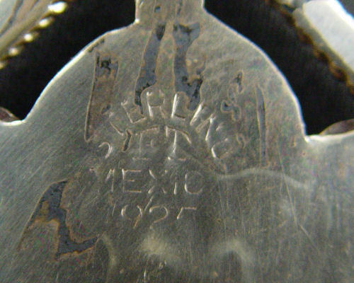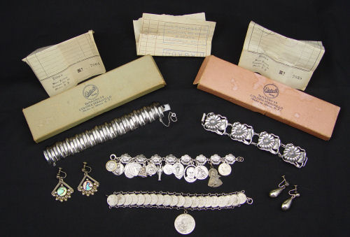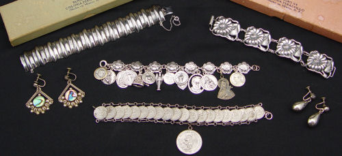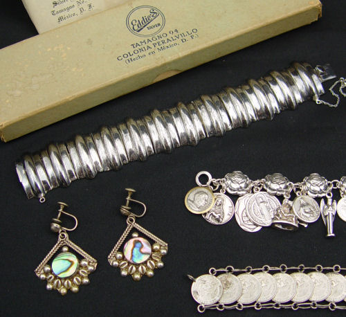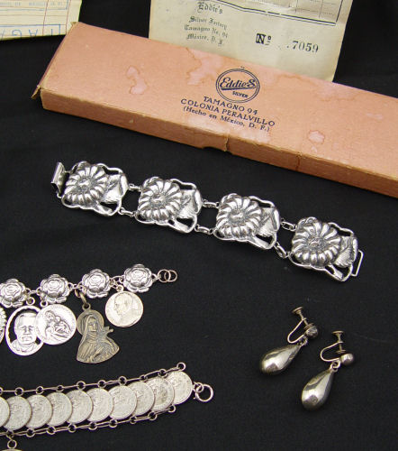 ESTATE LOT OF MEXICAN SILVER JEWELRY: To include four bracelets and two pair of earrings. Signed ribbed link bracelet, pressure clasp and safety chain, 7 1/4'', possibly lacquered as won't polish, marked MT? 925 Sterling. Sterling religious charm bracelet with 15 charms several also marked Sterling, approx. 7 1/2''. Coin bracelet constructed of all 1955 centavos with a 20 centavos charm, approx. 8'', no mark found. Puffed flower link bracelet marked Sterling, approx. 6 3/4''l. Tear drop screw back earrings with no mark, approx. 1 3/8''l. Sterling and abalone screw back earrings marked FT Sterling Mexico 925. Items marked sterling total weight approx. 6 Troy oz. Sold as a lot with two original Eddie's gift boxes and three receipts two of which are also from Eddie's.